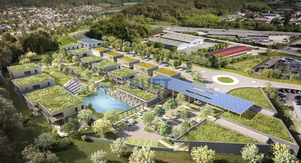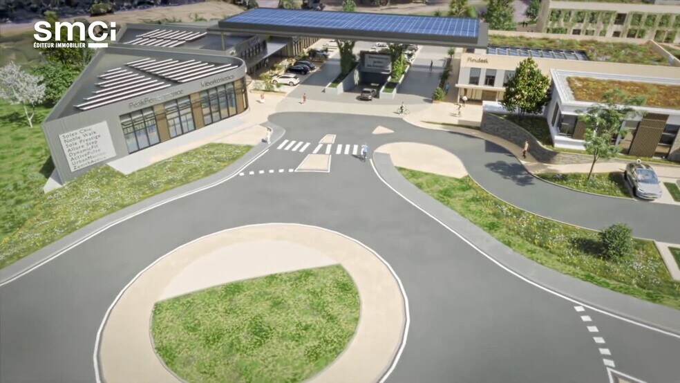 - Espaces extérieurs aménagés : l’ensemble est organisé autour d’un plan d’eau central, d’un parc paysagé et de cheminements piétons pour un cadre de travail agréable