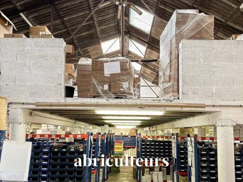 et sa mezzanine soutenue par des poteaux sur la moitié du bâtiment (environ 130 m2)