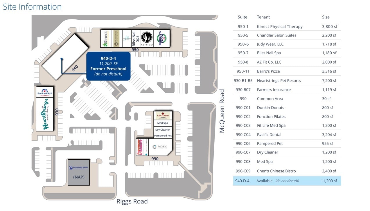 Riggs Landing presents a rare opportunity to lease ±11,200 SF of prime retail space in the heart of Chandler, Arizona. Formerly operating as a preschool, this space is ideally suited for educational, medical, or community-focused uses, and benefits from its placement within a vibrant, family-oriented shopping center. Strategically located at the northwest corner of Riggs Road and McQueen Road, the property boasts exceptional visibility with traffic counts exceeding 32,000 vehicles per day. The surrounding area is home to major employers such as Intel (11,270 employees), Wells Fargo (4,500), PayPal (1,750), and Orbital ATK (1,650), making it a high-demand corridor for daytime and residential traffic alike. The center is anchored by a diverse tenant mix including Pacific Dental, Barro’s Pizza, Dunkin Donuts, and Kinect Physical Therapy, creating strong co-tenancy appeal. Within a 3-mile radius, the average household income exceeds $168,000, and the population surpasses 67,000, offering an affluent and growing customer base. Surrounded by national retailers such as Target, Home Depot, CVS, and Safeway, and recreational amenities like Snedigar Sports Complex and Bear Creek Golf Complex, Riggs Landing is positioned to serve both local families and regional visitors. The site is easily accessible via major thoroughfares including Riggs Road, McQueen Road, and nearby Arizona Route 87.