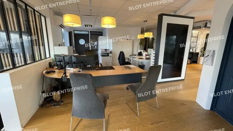 - Au RDC : hall d'accueil / showroom d'environ 110 m² et espace bureaux d'environ 76 m² (bureau cloisonné, pièce archive, local de rangement, sanitaires PMR, réfectoire, local technique avec baie de brassage) / Un entrepôt de stockage d'environ 191 m² et sanitaires, 2 portes sectionnelles / Un atelier d'environ 25 m²