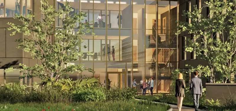 Il est constitué de deux volumes distincts réunis par un atrium central où sont disposés les circulations communes.