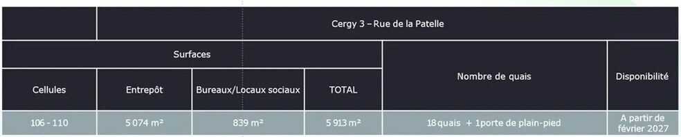| RDC | 5 074 m² | 3/6/9 | 83,00 € HT-HC/m²/an 6,92 € HT-HC/m²/mois 421 145 € HT-HC/an 35 095 € HT-HC/mois | Local d’activités | - | 31/01/2027 |