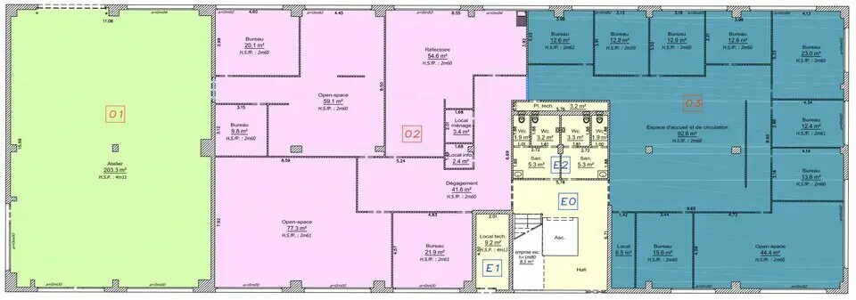 Ce bâtiment récent, situé dans un parc d'activité dynamique, propose à la location une surface totale de 1 631 m² répartis sur deux niveaux (RDC et R+1), idéale pour des bureaux et une activité légère ou de stockage. Le rez-de-chaussée comprend 853 m² de bureaux et 778 m² de local d’activité, tandis que le R+1 peut accueillir jusqu’à 23 bureaux modulables. Les espaces sont lumineux, avec de grands plateaux libres permettant un aménagement flexible selon les besoins de l’entreprise. Le bâtiment bénéficie d’une architecture moderne de très bon standing?: mur-rideau, bardage composite, sas vitré sécurisé, et 10 châssis vitrés assurant luminosité et visibilité. Les locaux disposent d’un faux-plafond avec éclairage LED à détection, de courants forts et faibles sur plinthes périphériques, ainsi que de blocs sanitaires aux normes PMR avec douches au RDC. Une zone du rez-de-chaussée est transformable en local de stockage avec accès par porte sectionnelle, et le sol est en dallage béton quartzé. La hauteur sous dalle béton est de 4 mètres, offrant un confort pour l’implantation de mobilier ou de racks.