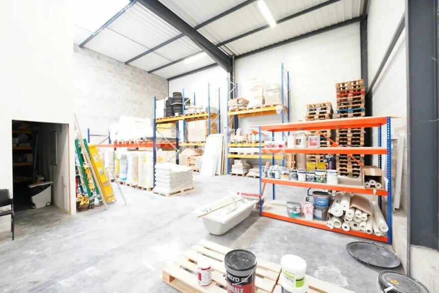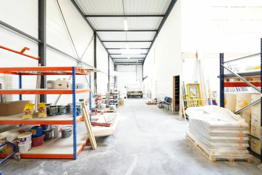 La partie entrepôt bénéficie d'une belle hauteur libre de 6,76 mètres, permettant un stockage vertical sur deux à trois niveaux. Elle est équipée du courant triphasé et d'une porte sectionnelle motorisée de 4,00 m (L) x 4,50 m (H), autorisant l'accès aux poids lourds et facilitant les opérations de chargement et de déchargement.