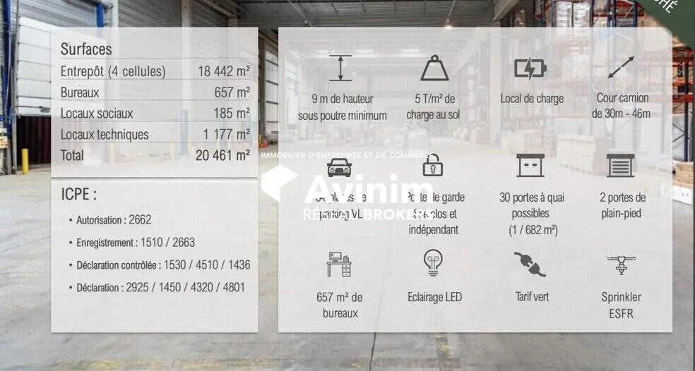 | RDC | 20 461 m² | Négociable | 85,00 € HT-HC/m²/an 7,08 € HT-HC/m²/mois 1 739 194 € HT-HC/an 144 933 € HT-HC/mois | Industriel/Logistique | - | Maintenant |