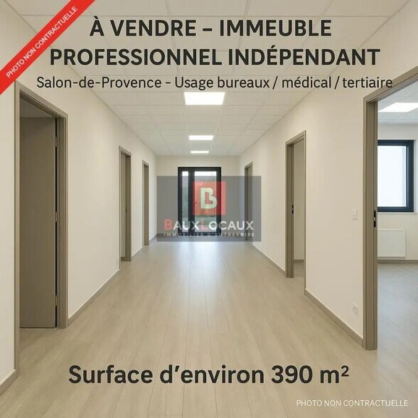 Immeuble professionnel indépendant - 390 m² environ - Salon-de-Provence À vendre à Salon-de-Provence, immeuble professionnel indépendant, actuellement exploité en clinique vétérinaire, offrant un fort potentiel de reconversion en bureaux ou pour activités tertiaires, médicales ou paramédicales. Le bâtiment développe une surface d'environ 390 m² bâtis, répartie sur RDC + étage, surfaces calculées à partir des plans, édifié sur une parcelle d'environ 1 086 m². Caractéristiques principales Surface totale : ~390 m² RDC + R+1 Accès PMR au rez-de-chaussée Configuration modulable, idéale bureaux Environ 10 stationnements privatifs Bâtiment indépendant, hors copropriété Climatisation réversible Tout-à-l'égout Zonage UC3 Usages possibles Bureaux (siège, agence, centre d'affaires) Professions libérales Activités médicales et paramédicales Centre de formation ou services Disponibilité Fin d'année 2026 (libération différée). Bien rare sur le secteur de Salon-de-Provence. Dossier complet et plans sur demande. - Accès Handicapés - Accès plain-pied - Alarme anti intrusions - Banque d'accueil - Bureaux cloisonnés - Câblage RJ45 - Carrelages - Chauffage réversible - Climatisation - Courant faible - Etablissement recevant du public - Fibre optique - Installation électrique existante - Menuiseries posées - Nbre Parkings extérieurs : 10 - Salle de repos - Sanitaires privés - Terrain bitumé - Terrain clos - Toiture isolée - Volets électriques
