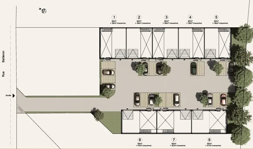 A VENDRE SARZEAU presqu'île de Rhuys (56), CELLULES D'ACTIVITES ET DE STOCKAGE NEUVES (112 m² ou 135 m² selon disponibilité) composées d'un atelier avec porte sectionnelle, une mezzanine (et non Bureaux) avec escalier, livrées avec électricité, plomberie, compteurs eau-élec. Parking.