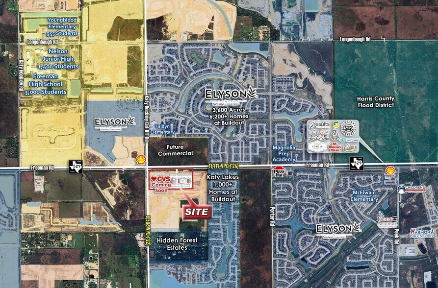 Le développement de 4,38 acres, stratégiquement situé à l'angle sud-est de FM-529/Freeman Rd et Katy-Hockley Cut-Off, promet d'être un ajout clé à la région. Cet emplacement privilégié devrait bénéficier énormément de la proximité de nouveaux établissements d'enseignement, notamment un lycée, un collège et une école primaire, dont l'ouverture est prévue pour l'automne 2024, à environ 1,6 km du site. De plus, le développement est situé juste en face de la vaste communauté planifiée de 3 600 acres d'Elyson, qui comptera plus de 6 200 logements une fois achevée, renforçant ainsi la croissance et l'attrait de la région.