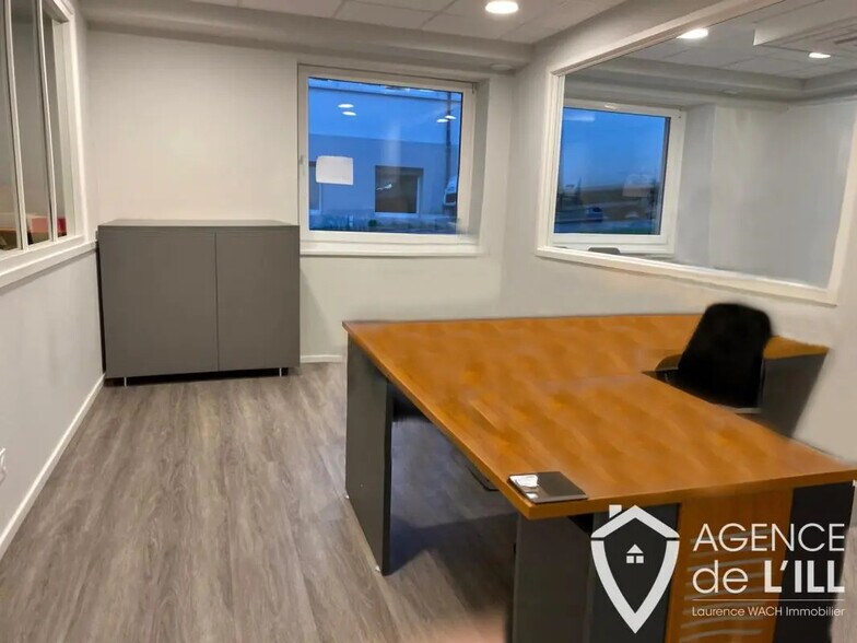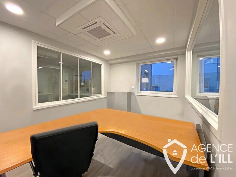 Beaux bureaux composés de 6 pièces, 2 WC, un local technique avec un chauffe-eau, un local technique électrique, un dégagement distribuant l'ensemble des pièces décrites, sur 119,38 m2 et une zone de stockage de 93,06, pour une surface totale de 212,44 m2. (Voir plan en annexes) - 2 places de parking avec chargeur éléctrique - L'une des pièces comprends une cuisine équipée - Ce bien vous interesse ? Contactez l'Agence de l'Ill - 03 88 92 05 86 - 06 52 53 86 57 - Emmanuel LIEPPE
