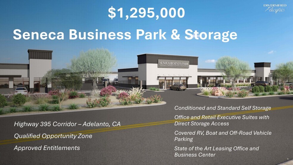 Prime Entitled Development with Highway 395 Visibility Seneca Business Park & Storage is a fully entitled self-storage and retail development located at the southeast corner of Seneca Road and Pearmain Street in Adelanto, CA. The property offers exposure along Highway 395, connecting Southern California’s ports and logistics hubs with Northern Nevada and serving over 50 million consumers across the Western U.S. The project includes climate-controlled and drive-up storage, covered RV/boat/off-road parking, executive office suites, and retail space, supported by a state-of-the-art leasing office and business center. Strategically positioned less than four miles from Southern California Logistics Airport—home to Amazon, FedEx, and major industrial users—the site benefits from growing contractor demand, regional logistics expansion, and significant residential growth. Within a 3-mile radius, more than 1,000 homes are under construction or entitled. As part of a Qualified Opportunity Zone, this development provides investors with tax advantages, municipal support, and long-term demand drivers. Seneca Business Park & Self Storage is uniquely positioned to capture the underserved storage and commercial market in the High Desert.