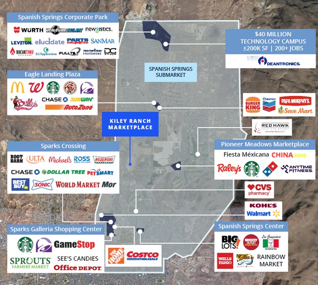 Livraison prévue, phase 1, quatrième trimestre 2026. Kiley Ranch Marketplace est un centre commercial régional prévu situé dans le sous-marché de Spanish Springs à Sparks, dans le Nevada. Spanish Springs est le sous-marché résidentiel qui connaît la croissance la plus rapide de la MSA de Reno/Sparks. Situé à l'angle balisé de Pyramid Hwy et de Wingfield Hills Road. Pyramid Hwy est la principale artère de banlieue entre l'I-80 et Spanish Springs, avec un trafic quotidien de plus de 40 500 personnes. Projet de développement commercial en plusieurs phases.