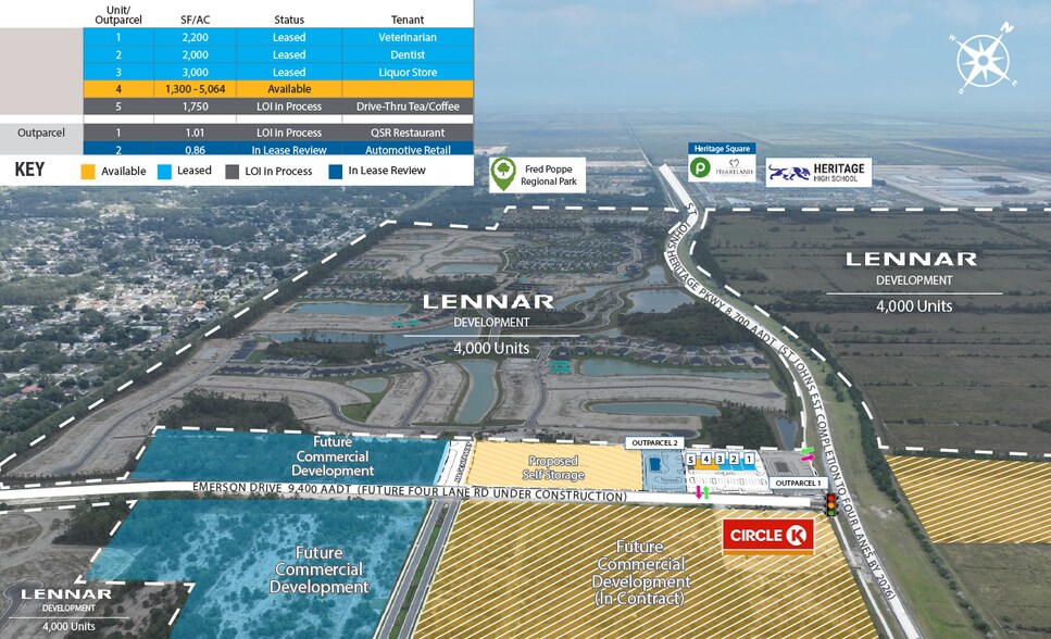 Situé dans la plus grande ville du comté de Brevard, Palm Bay, qui connaît une croissance résidentielle massive avec plus de 14 000 nouveaux logements approuvés ou en construction dans un rayon de 5 miles de cet emplacement. À proximité de l'intersection principale entre la St. Johns Heritage Parkway et Emerson Drive, qui est la composante commerciale de la communauté de 4 000 habitants de Lennar, Everlands, qui entoure ces parcelles. Le feu de circulation est entièrement financé et approuvé et devrait être installé plus tard cette année. Directement au nord se trouve le Platt Ranch qui a été approuvé pour 4 672 logements, environ 500 000 pieds carrés de commerces et plusieurs écoles pouvant accueillir 1 700 élèves. La construction à quatre voies de la promenade St. Johns Heritage, entre l'autoroute 192 et le chemin Malabar, devrait également commencer plus tard cette année et la construction à quatre voies de la promenade Emerson a déjà commencé à l'est de ce site et se poursuivra jusqu'à St. Johns Pkwy. La St. Johns Heritage Pkwy a été construite pour que les résidents de cette région du sud-ouest du comté de Brevard puissent accéder facilement aux zones environnantes et constitue la principale route pour les résidents locaux qui se rendent au travail, principalement vers le nord. La St. Johns Heritage Pkwy sera prolongée vers le sud à partir de Malabar Rd, pour finalement rejoindre l'Interstate 95. À un peu plus de trois kilomètres au sud, un nouveau centre commercial ancré à Publix se trouve à l'angle nord-ouest de St. Johns Heritage Pkwy et Malabar Rd. Les opportunités commerciales étant minimes sur la St. John's Heritage Pkwy, il s'agit de la première opportunité commerciale. Il y a environ 2 500 étudiants dans cette zone et 1 700 étudiants supplémentaires sont prévus.