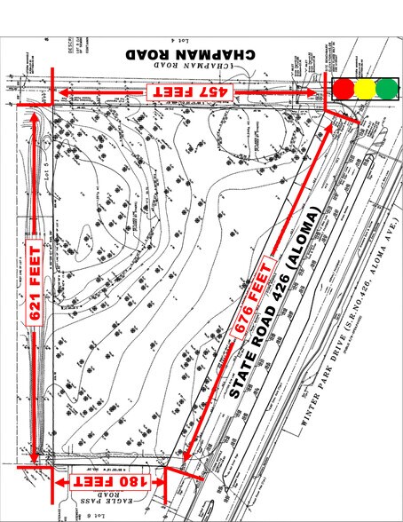 Situated on the southwest corner of Aloma Avenue and Chapman Road, a 5.12-acre commercial development site offers a commanding presence at a signalized intersection in Oviedo, Florida. Spanning approximately 676 feet of frontage along State Road 426, the site includes access off of Aloma (SR 426), Chapman, and Eagle Pass Road. It provides exceptional visibility and strong signage potential along this active corridor.