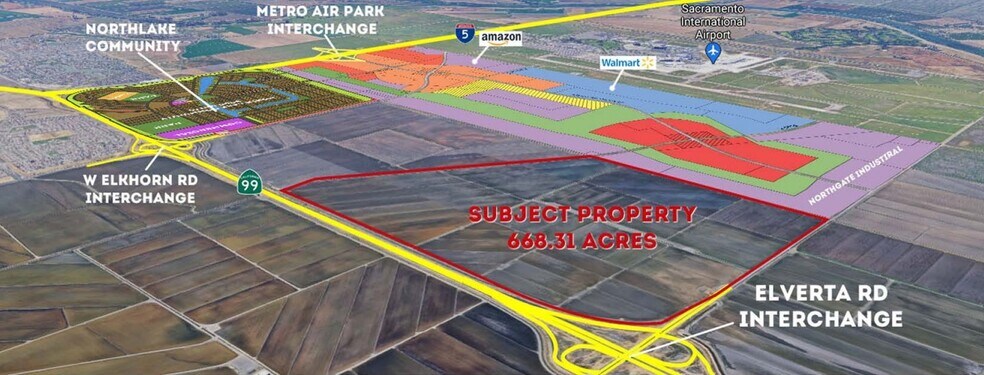 Helm Properties a le plaisir de présenter l'opportunité d'acquérir le premier terrain à développer adjacent à Metro Air Park et à l'aéroport international de Sacramento. Les quelque 668 acres sont situés à 2,1 km le long de l'autoroute 99, juste au sud de l'échangeur Elverta Rd.
