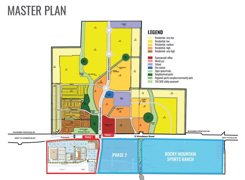 • 77 Acres – Phase 1 (West) available now • Strategic location between Falcon and Powers Blvd corridor • Signalized interchange at Woodmen & Banning Lewis Pkwy • North / South Connection to housing growth