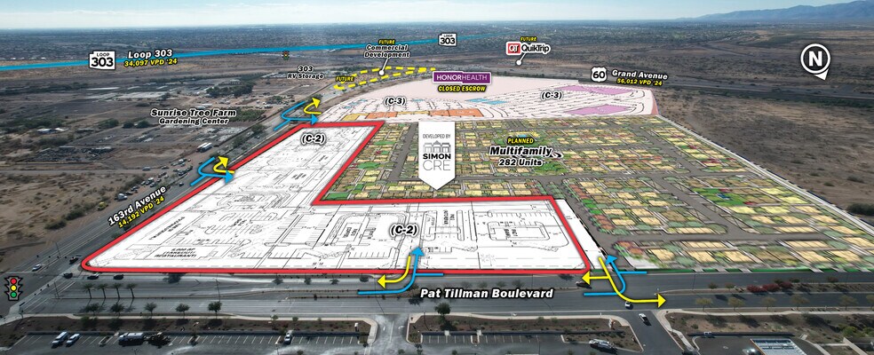 - Zoned C-2 (12.14 AC) and C-3 (30 AC), City of Surprise - Mixed-use project consisting of retail, commercial, hospital/medical office, and approximately 282 rental cottage homes - Across from brand new Fry's Marketplace - Convenient access to Grand Ave, 163rd Ave, Pat Tillman Blvd, and Loop 303 - Adjacent to Asante master-planned community with over 15,665 planned housing units