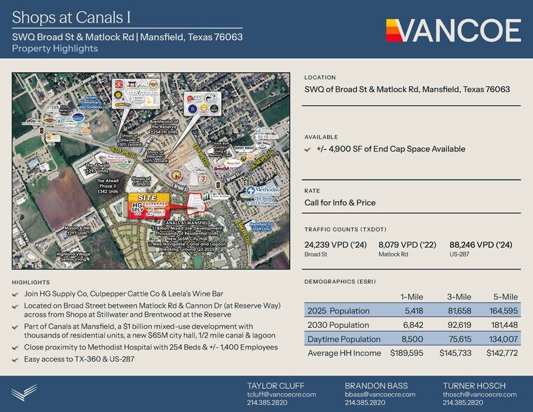 - Part of Canals at Mansfield, a $1 billion mixed-use development with thousands of residential units, a new $65M city hall, 1/2 mile canal & lagoon