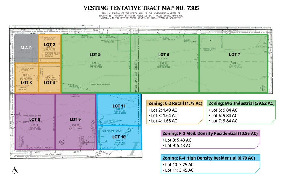 • Lots 2-5: 4.78 total acres of C-2 Retail • Lots 5-6: 29.52 total acres of M-2 Industrial • Lots 8-9: 10.86 total acres of R-2 Medium Density Residential • Lots 10-11: 6.70 total acres of High Density Residential
