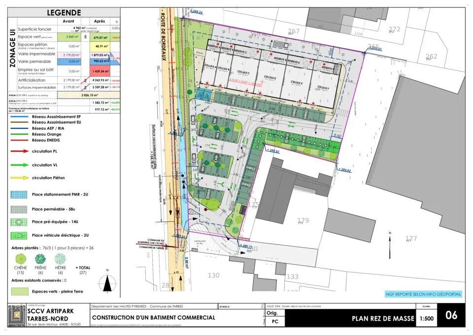 A louer en BEFA, cellules commerciales de 1120 m² divisibles dont 871 m² de surfaces de vente et 248,08 m² de réserve situées sur l'axe passant de la route de Bordeaux au nord de Tarbes. Plus de 50 places de parking Les surfaces sont modifiables et divisibles selon les besoins des preneurs. Le terrain est situé à proximité immédiate des commerces de type Action, Mac Donald, Lidl... et possède une grande visibilité. Le passage est de plus de 8000 véhicules jours Loyer : 132 Euros /m²/mois HT/HC Honoraires : 15% d'une année de loyer pleine HT/HC Possibilité de vente du Terrain avec PC purgé et VEFA : 1450 Euros HT/m² (réseaux en attente) (isolation en sus) Honoraires : 5 % HT du prix net vendeur à la charge exclusive de l'acquéreur Référence : 23325