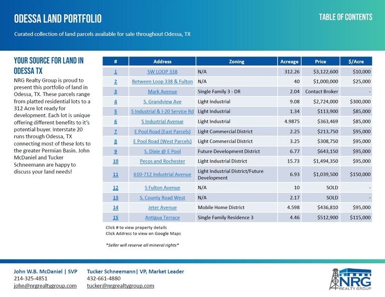 NRG Realty Group is proud to present this portfolio of land in Odessa, TX. These parcels range from individual residential lots to a 312 Acre lot ready for development. Each lot is unique offering different benefits to it’s potential buyer. Interstate 20 runs through Odessa, TX connecting most of these lots to the greater Permian Basin. John McDaniel and Tucker Schneemann are happy to discuss your land needs! Lot 7: This offering features 3 parcels combined for a total of 2.25 Acres of land zoned Light Commercial District. The parcels are all rectangular with excellent access. The parcel is located on Pool Rd that runs parallel to Interstate 20. Lot 8: This offering features 3 parcels combined for a total of 3.25 Acres of land zoned Light Commercial District. The parcels are all rectangular with excellent access. The parcel is located on Pool Rd that runs parallel to Interstate 20, and also fronts Rochester Ave. Lot 9: This parcel features 6.77 Acres of land zoned Future Development District. The site is rectangular. Excellent access from E Pool Rd and S Dixie Blvd just off of Interstate 20. Lot 10: This parcel features 15.73 Acres of land zoned Light Industrial District. The site is a bit irregular shape but all space is useable. The site can be accessed by Rochester Ave or Pecos St – just off of Interstate 20.