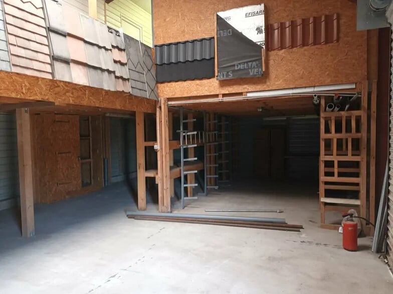 - au rez-de-chaussée (412 m²) : un atelier-entrepôt en plusieurs zones pour 363 m² (accessible par 2 rideaux métalliques électriques de L 2,5 x H 3 m), un bureau d'accueil de 20 m², un réfectoire de 24 m² et 2 sanitaires.
