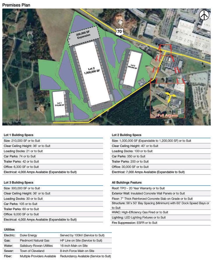 InSite Real Estate présente Cleveland Commerce Park, un site prêt à être construit sur mesure situé à Cleveland, en Caroline du Nord (Charlotte MSA). Zoné M-1 (industriel), ce site peut répondre à des besoins allant jusqu'à 1 710 000 pieds carrés et offre un temps de trajet minimal vers les autoroutes 77, 85 et 40 via l'US Highway 70. La due diligence est terminée et de nombreuses incitations nationales, régionales et locales sont disponibles. Idéalement situé à 53 minutes de route de Charlotte, cet établissement se trouve également à 77 miles de l'aéroport international Charlotte Douglas, à 250 miles du port de Charlotte et à 295 miles du port de Savannah.