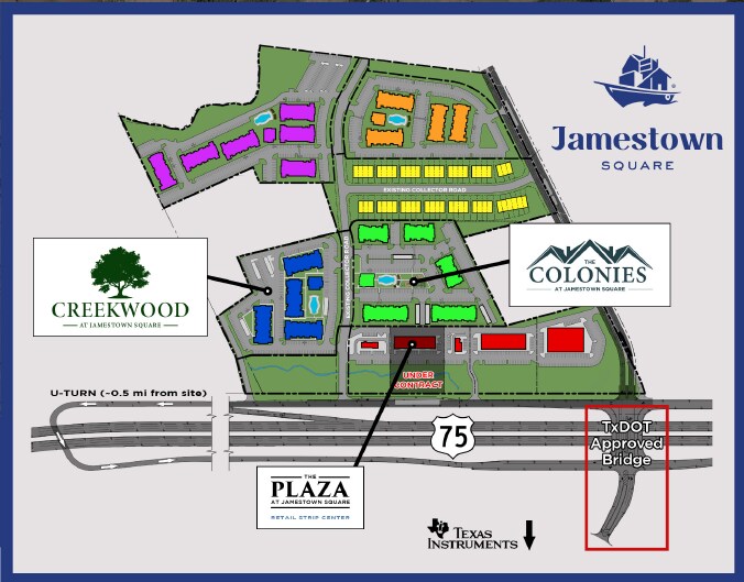 Jamestown is a 48-acre master-planned mixed-use development positioned at the center of Sherman’s unprecedented economic expansion, driven by the $30B Texas Instruments megafab and the rapidly growing Coherent/Finisar manufacturing campus. The area’s rapid job creation, housing demand, and infrastructure investment make this an exceptional opportunity for retail, multifamily, commercial, and mixed-use development. Key Highlights: • 48-acre mixed-use development with retail, MF, commercial, and outparcel opportunities • Located across the highway from TI’s $30B semiconductor megafab and Coherent/Finisar expansions • Utilities proximate; roadway expansion and infrastructure upgrades underway • Surrounded by rapidly growing single-family and multifamily communities • High demand for QSR, medical, service retail, and neighborhood commercial • Significant employment density and population growth are driving sustained absorption • Ideal for phased development and long-term commercial investment For details, send us an email inquiry, and we will respond promptly.