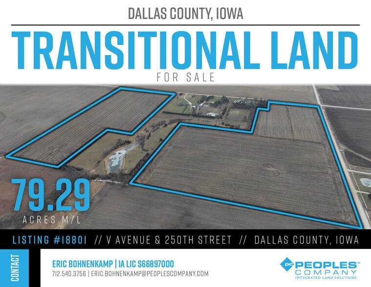 Dallas County Transitional Land For Sale – Peoples Company is pleased to offer 79.29 acres m/l of transitional farmland located in Dallas County, Iowa, just north of Urbandale’s corporate limits and west of the City of Grimes. The property is strategically positioned within the path of development and benefits from close proximity to both existing neighborhoods and planned residential projects in the rapidly growing western suburbs of the Des Moines metropolitan area. The farm is conveniently located approximately 0.5 miles west of Alice’s Road and 0.75 miles south of Highway 44, providing excellent access to both Waukee and Grimes. The property is situated within the highly regarded Dallas Center–Grimes Community School District, further enhancing its appeal for future residential development. According to the City of Urbandale’s comprehensive plan, the property lies within the Western Growth Area, highlighting its long-term development potential. Urbandale city limits are located approximately 0.25 miles south of the property. Public infrastructure is nearby, with an Urbandale trunk sewer main located roughly 0.75 miles from the property. Additionally, Xenia Rural Water provides service through an 8-inch water main along 250th Street and a 4-inch water main along V Avenue. The property is divided into two separate tracts, is 100% tillable, and features an outstanding CSR2 rating of 88. The farm is leased for the 2026 crop year. For additional information, please contact the listing agent.