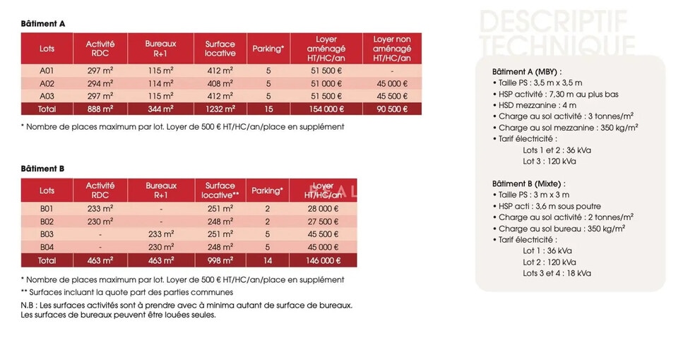À 15 km du centre-ville, aux portes de Lyon dans la première couronne Est, nous vous proposons à la location au sein d'un nouveau parc d'activités clos et sécurisé, des locaux d'activités et des bureaux neufs. Ce parc est composé d'un bâtiment de type MBy de 3 cellules proposant des surfaces d'activité en RDC avec possibilité d'aménager des bureaux en mezzanine et d'un 2ème bâtiment qui est un bâtiment Mixte, développant 2 cellules d'activités au RDC ainsi que 2 lots de bureaux au R+1. Livraison le 1er août 2026 ! Location Locaux d'Activités et Bureaux neufs - Vaulx en Velin (69120) - 2 230 m² divisibles à partir de 408 m² Bâtiment A (MBY) : Porte sectionnelle de 3,5 m x 3,5 m pour chaque lot HSP activité : 7,30 m au plus bas HSD mezzanine : 4 m Charge au sol activité : 3T/m² Charge au sol mezzanine : 350 kg/m² Tarif électricité : Lots 1 et 2 : 36 kVa Lot 3 : 120 kVa Mezzanines pouvant être aménagées en bureaux Mezzanine : . Soit mezzanine non aménagée . Soit mezzanine aménagée en bureaux Bâtiment B (Mixte) : Porte sectionnelle de 3 m x 3 m HSP activité : 3,6 m sous poutre Charge au sol activité : 2T/m² Charge au sol bureau : 350 kg/m² Tarif électricité : Lot 1 : 36 kVa Lot 2 : 120 kVa Lots 3 et 4 : 18 kVa Surfaces incluant la quote part des parties communes Les surfaces activités sont à prendre avec à minima autant de surface de bureaux. Les surfaces de bureaux peuvent être louées seules. Situation/Transports : Route En façade du Bd Urbain Est (Bd des Droits de l'Homme) et à 10 min de la Rocade Est (A46) et du Bd Périphérique Laurent Bonnevay. Bus Bus TCL lignes C200, 24, 25, 28, 52, 68, 79, Zi3 et Zi5 Dépot de garantie : 3 mois de loyer HT/HC Conditions particulières à la location : Parkings non inclus dans le loyer : Loyer parkings : 500 euros HT/HC/Unité/an