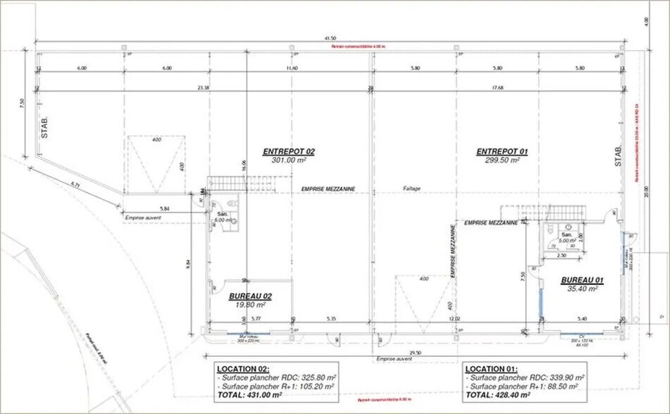 Local d'activités neuf à louer, situé au sud-ouest de Toulouse Dans un petit ensemble immobilier, local d'activités neuf d'une surface de 428 m² Une partie bureaux sur deux niveaux totalisant 123,9 m², avec salle de réunion, bureaux, sanitaires... Une partie dépôt de 299 m² avec porte sectionnelle électrique (4x4m), dalle béton quartz Bâtiment type structure métallique, bardage double peau Terrain clôturé avec portail Bureaux RDC : 35,40 m² Bureaux R+1 : 88,50 m² Dépôt : 299,50 m² (LOT 01 sur plans) Situation/Transports : Accès : par A64 sorties n° 38 et 39 Dépot de garantie : 3 mois de loyer HT HC Conditions particulières à la location : Bail : Commercial 3/6/9 ans