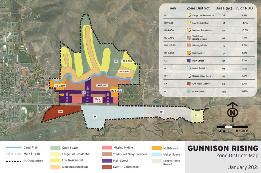 The Gunnison Rising project is one of the largest land opportunities in Western Colorado — offering a master-planned framework for 1,700 residential units and 920,000 square feet of commercial, hospitality, and industrial space directly adjacent to Western Colorado University and Gunnison-Crested Butte Regional Airport, and ~28 Miles from the Crested Butte Mountain Resort. As a shovel ready, fully entitled, master-planned mountain town community ripe with opportunity and natural beauty, Gunnison Rising presents a once in a lifetime opportunity to help shape the future of the entire Gunnison Valley. Designed to create the ultimate work-life balance alongside the endless amenities Gunnison Valley has to offer, Gunnison Rising will offer walkable trail-oriented neighborhoods, every home within a short walk to a park, immediate adjacency to Western Colorado University, easy access to Tomichi Creek State Wildlife Area, a regional trail head park connection to Signal Peak, and a planned connection to Hartman Rocks. The plan also includes an events center, a “Makers District” for entrepreneurs and business growth, a “Government Campus” and an RV & Glamping Resort. Nearby amenities just a short walk, bike ride or drive away include Downtown Gunnison, the Jorgenson Ice Rink and Event Center, Gunnison Whitewater Park, Dos Rios Golf Club, as well as the Hartman Rocks Recreation Area and Blue Mesa Reservoir for additional outdoor recreation opportunities including sailing, waterskiing, swimming, fishing, and horseback riding. Ski and snowboard enthusiasts can head to Monarch Mountain to the east or Crested Butte Mountain Resort (CBMR) to the north for the ultimate ski experience. For ease and simplicity, residents can ride the free RTA bus from Gunnison to the base of CBMR.