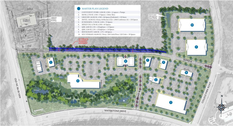 Situé à l'angle de Waterstone Drive et de l'ancienne NC-86 dans le comté d'Orange Au nord de l'I-40 et de la NC-86 À l'est de l'échangeur I-40 et I-85 Accès facile aux marchés du Triangle et de la Triade À côté du Durham Tech Community College, de l'hôpital UNC, du campus de Hillsborough et du marché fermier de Hillsborough Au coin du futur site industriel du Research Triangle Logistics Park de 2,4 millions de pieds carrés Les municipalités du comté d'Orange incluent Chapel Hill, Carrboro, Mebane et Hillsborough