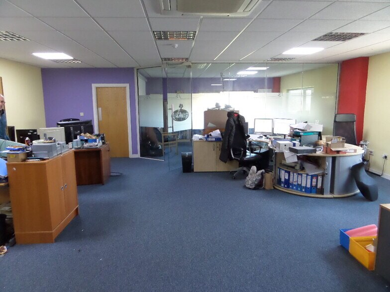 L'espace disponible comprend une unité industrielle avec terrasse d'extrémité offrant une hauteur de gouttière minimale de 5,85 m. La zone de l'entrepôt est accessible par un volet roulant en acier menant à la façade avant et bénéficie d'un éclairage au sodium monté au plafond. Des bureaux de deux étages ont été construits et offrent un mélange de bureaux décloisonnés et d'espaces d'exposition, en plus de salles de réunion, d'une cuisine et de toilettes. Les spécifications comprennent la climatisation, les plafonds suspendus, l'éclairage d'entrée et les radiateurs au gaz. La configuration actuelle des bureaux peut être adaptée en conséquence. À l'extérieur, il y a des places de parking réservées et le chargement se trouve sur l'élévation avant.