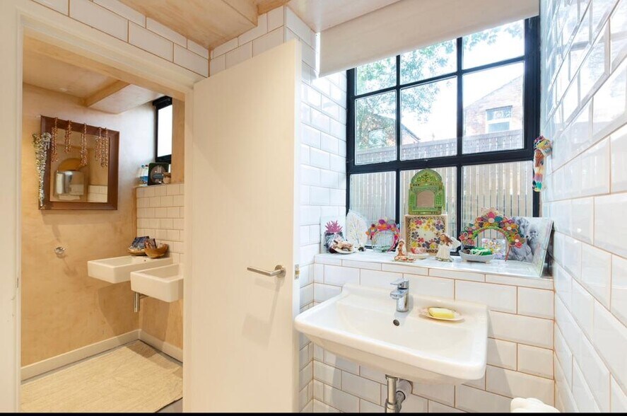 Le bureau attenant sur deux niveaux comprend un studio décloisonné avec 3 portes à volets roulants donnant directement sur l'atrium couvert et à l'arrière du studio se trouve un WC. Le studio possède des murs en plâtre brut poli, des RSJ de soutien apparents et un sol en béton poli et en résine. Un escalier ouvert menant à l'arrière du rez-de-chaussée mène à un autre studio au 1er étage, équipé d'une cuisine et d'une salle de douche privative. Les murs sont peints en blanc, avec du parquet en chêne d'ingénierie et des fenêtres Crittall.